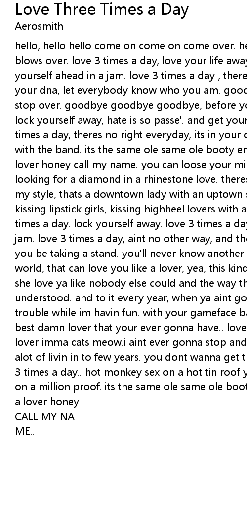 hello, hello hello come on come on come over. hello hello hello until the storm blows over. love 3 times a day, love your life away. love 3 times a day and get yourself ahead in a jam. love 3 times a day , there aint no other way, its in your dna, let everybody know who you am. goodbye,goodbye,goodbye, nice of you to stop over. goodbye goodbye goodbye, before you do roll over. love3 times a day lock yourself away, hate is so passe'. and get yourself ahead in a jam. love 3 times a day, theres no right everyday, its in your dna.and tell em that you came with the band. its the same ole same ole booty entertain, if you really need a lover honey call my name. you can loose your mind looking for a love, like your looking for a diamond in a rhinestone love. theres one kind of lover thats just my style, thats a downtown lady with an uptown smile. imma tophat , gloves, kissing lipstick girls, kissing highheel lovers with a silver spoons. love 3 times a day. lock yourself away. love 3 times a day, and get yourself ahead in a jam. love 3 times a day, aint no other way, and then a matinee'. its time that you be taking a stand. you'll never know another lover lover in the whole wide world, that can love you like a lover, yea, this kind of girl. you can pray that she love ya like nobody else could and the way that she could love ya everybody understood. and to it every year, when ya aint got none, you'll be gettin out of trouble while im havin fun. with your gameface baby, dont ya look so sad, im the best damn lover that your ever gonna have.. love 3 times a day. im a topsheet lover imma cats meow.i aint ever gonna stop and ill never know how.. say ya done alot of livin in to few years. you dont wanna get trapped so lets sincere.. love 3 times a day.. hot monkey sex on a hot tin roof you'll be higher than a child on a million proof. its the same ole same ole booty entertain if ya really need a lover honey |