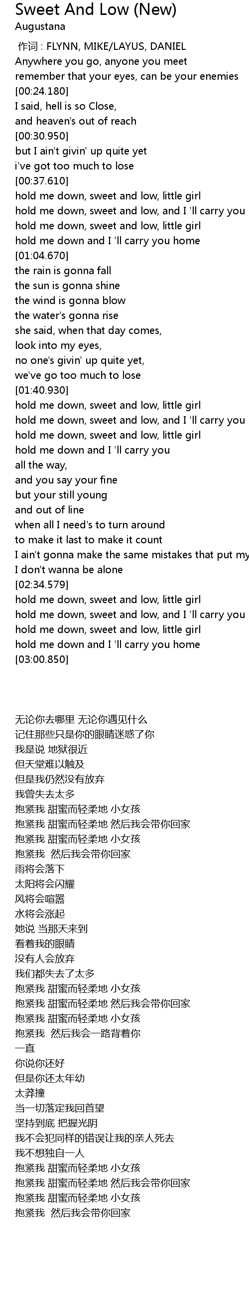 | [00:44.10] | hold me down, sweet and low, and I ' ll carry you home |