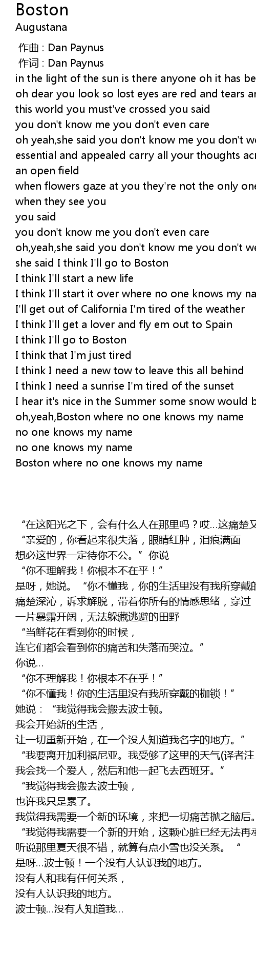 | [03:28.290] | oh,yeah,Boston where no one knows my name |