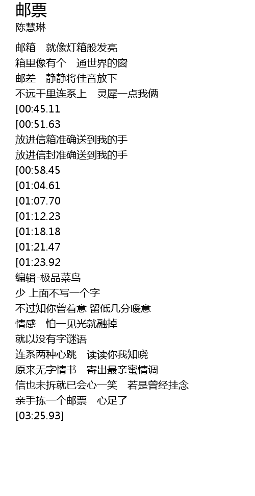 | [02:33.43][01:23.92] | 只收到一个邮票 都心跳* |