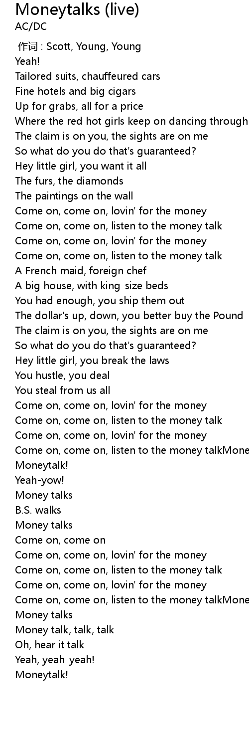 | [02:16.39] | Come on, come on, listen to the money talkMoney talks |