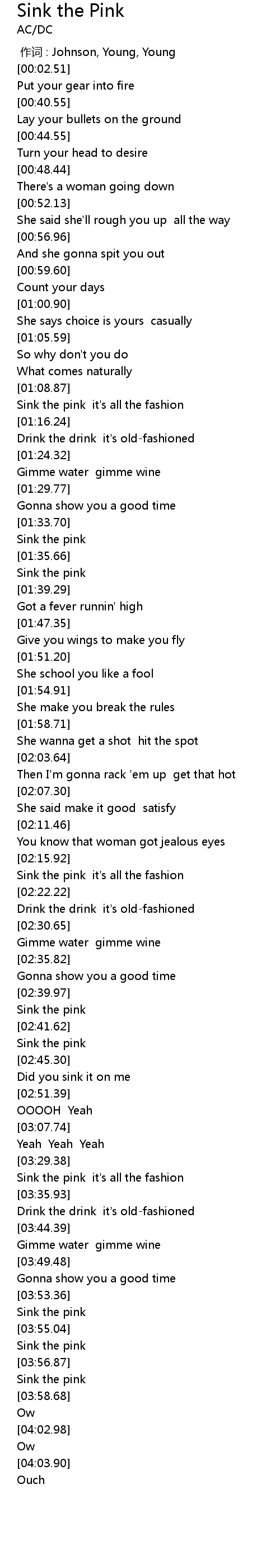 | [02:17.91] | Sink the pink it' s all the fashion |