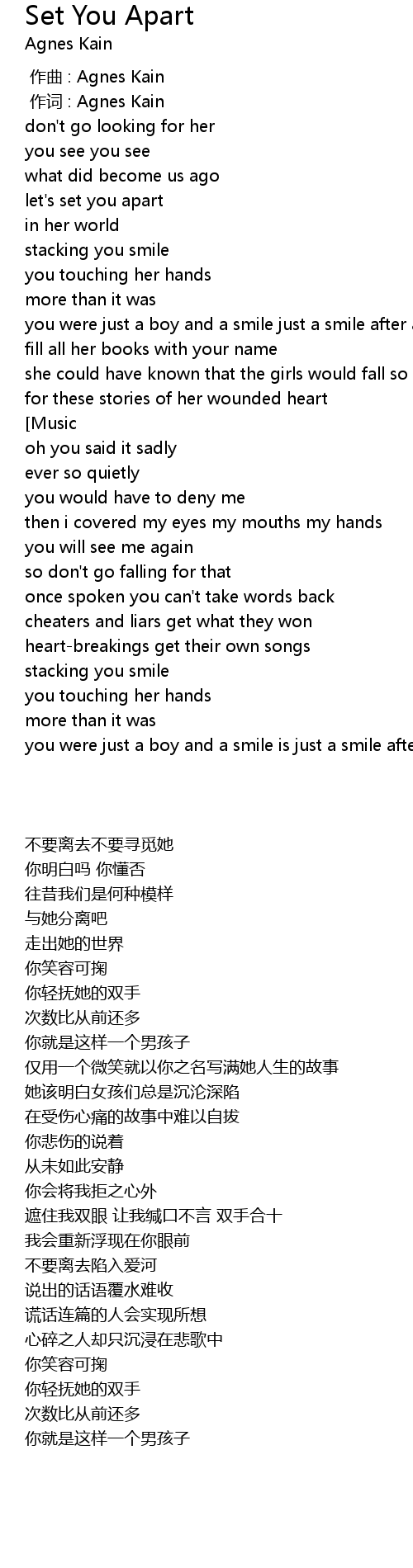 | [00:01.00] | 作词 : Agnes Kain |