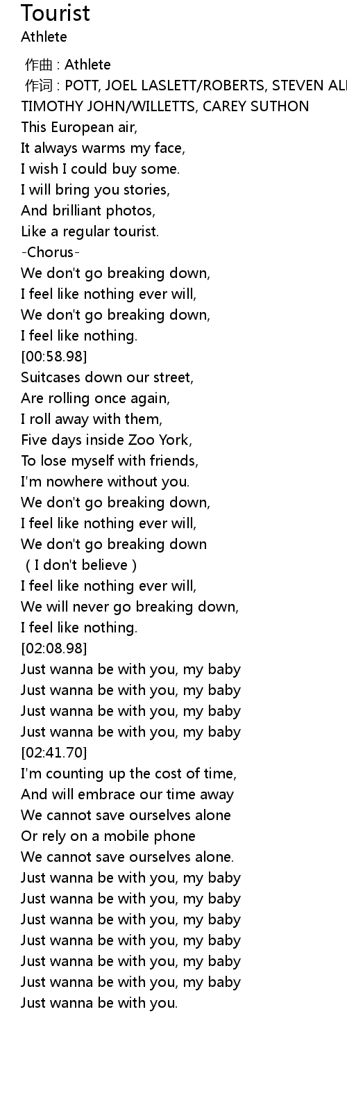 | [00:01.00] | 作词 : POTT, JOEL LASLETT/ROBERTS, STEVEN ALEXANDER/WANSTALL, TIMOTHY JOHN/WILLETTS, CAREY SUTHON |