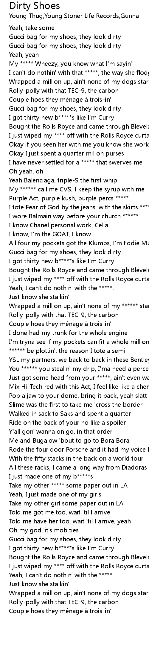 | [02:51.81] | Gucci bag for my shoes, they look dirty |