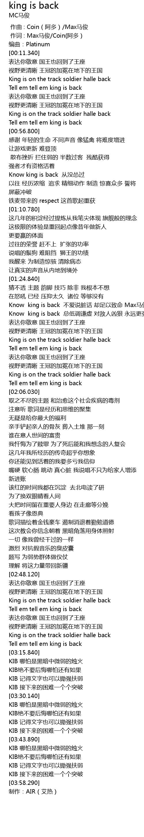 | [01:35.290] | Know king is back 总低调谦虚 对敌人凶狠 永远更强劲 |
