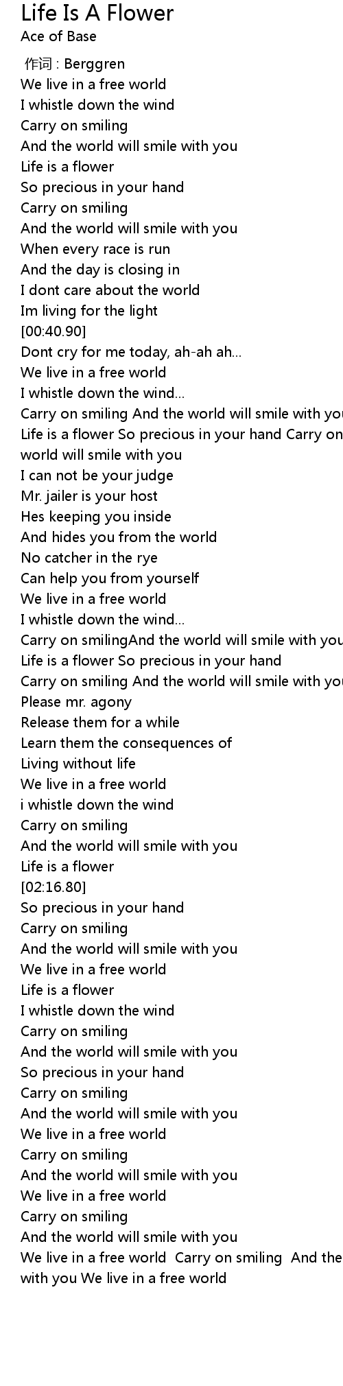 | [00:55.85] | Life is a flower So precious in your hand Carry on smiling And the world will smile with you |