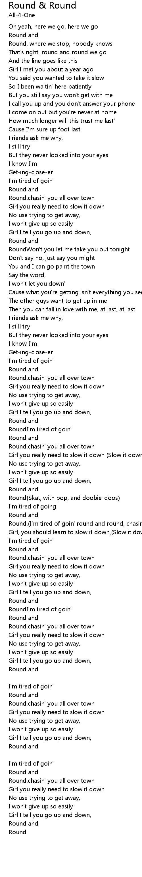 | Round,(I'm tired of goin' round and round, chasin you all over town)round | |