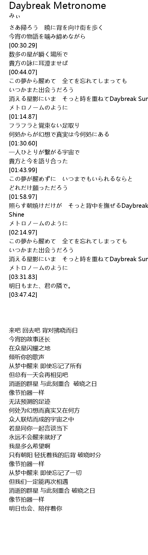 | [00:59.35] | 消える星影にいま そっと時を重ねてDaybreak Sun |
