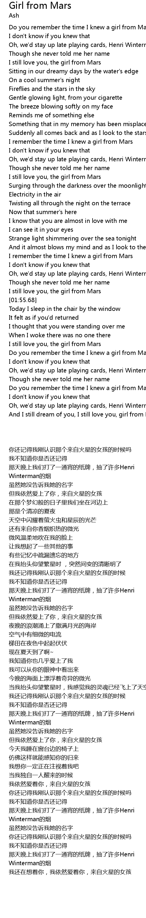 | [00:00.53] | Do you remember the time I knew a girl from Mars? |
