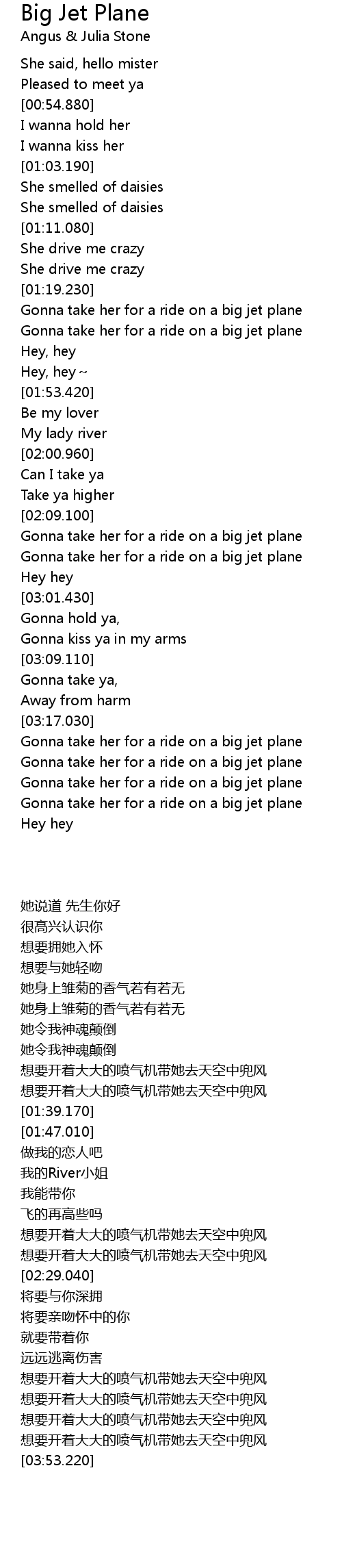 | [01:23.720] | Gonna take her for a ride on a big jet plane |