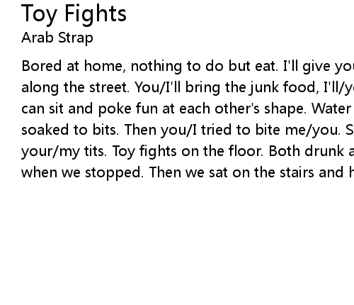| Bored at home, nothing to do but eat. I'll give you a phone and you can come along the street. You/I'll bring the junk food, I'll/you (can) hire the tape. We can sit and poke fun at each other's shape. Water pistols at dawn. We were soaked to bits. Then you/I tried to bite me/you. So I/you hand-held hovered your/my tits. Toy fights on the floor. Both drunk and drugged. Out of breath when we stopped. Then we sat on the stairs and hugged. |