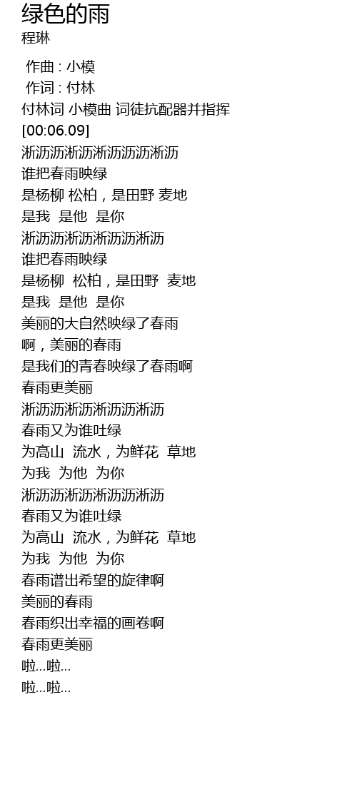 | [00:36.47] | měi lì de dà zì rán yìng lǜ le chūn yǔ |