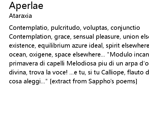 | Contemplation, grace, sensual pleasure, union elsewhere... desire, destiny, existence, equilibrium azure ideal, spirit elsewhere... mysteries, music, birth, ocean, oxigene, space elsewhere... "Modulo incanti e incanti io so dire vibrando primavera di capelli Melodiosa piu di un arpa d'oro, piu dell'oro, parlami cetra divina, trova la voce! ...e tu, si tu Calliope, flauto dolcenota, piu d'ogni cosa aleggi..." [extract from Sappho's poems] |