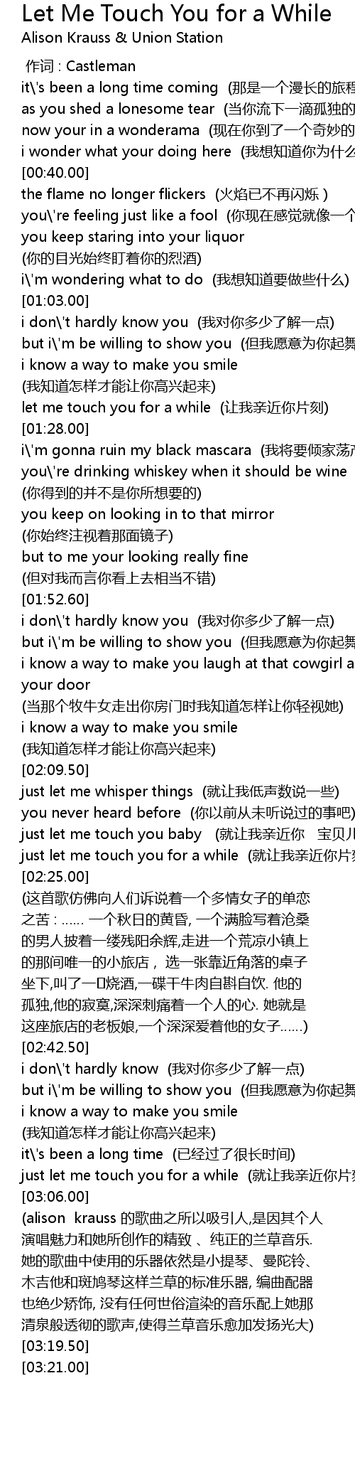 | [03:08.00] | (alison krauss 的歌曲之所以吸引人,是因其个人 |
