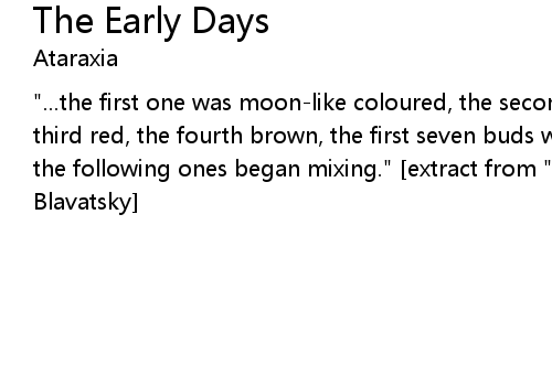| "...the first one was moon-like coloured, the second was gold-like yellow, the third red, the fourth brown, the first seven buds were all of the same colour, the following ones began mixing." [extract from "The Book of Dzyan" by M. Blavatsky] |