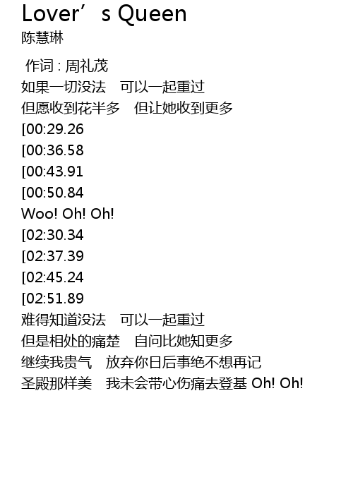 | [03:58.28][02:51.89][01:27.67] | 到尾不过被储立情人皇后 偏找不到公爵 心牵手 |