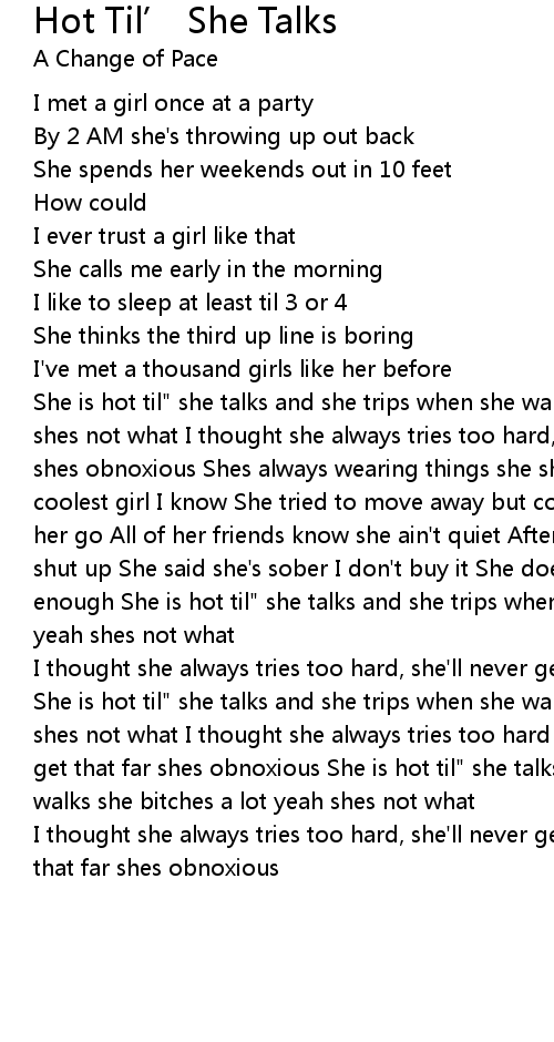 She is hot til" she talks and she trips when she walks she bitches a lot yeah shes not what I thought she always tries too hard, she'll never get that far shes obnoxious Shes always wearing things she shouldn't She thinks that shes the coolest girl I know She tried to move away but couldn't I'm hoping Arizona lets her go All of her friends know she ain't quiet After a couple drinks she won't shut up She said she's sober I don't buy it She doesn't get it that i've had enough She is hot til" she talks and she trips when she walks she bitches a lot yeah shes not what |