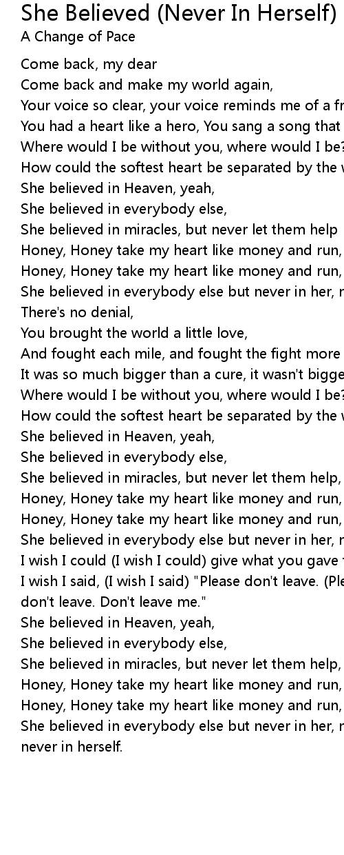 She believed in everybody else but never in her, never in her, never in her, never in herself. |