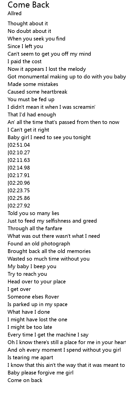 | [03:10.38][02:27.92][01:13.21] | Come back to me |