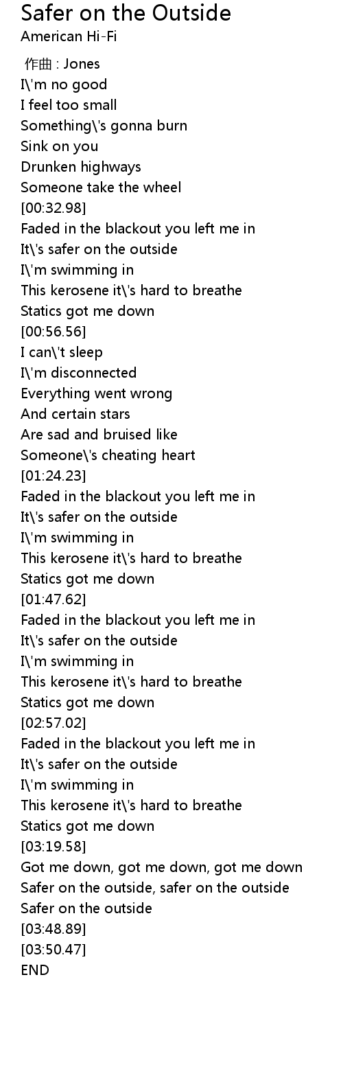 | [03:32.82] | Safer on the outside, safer on the outside |