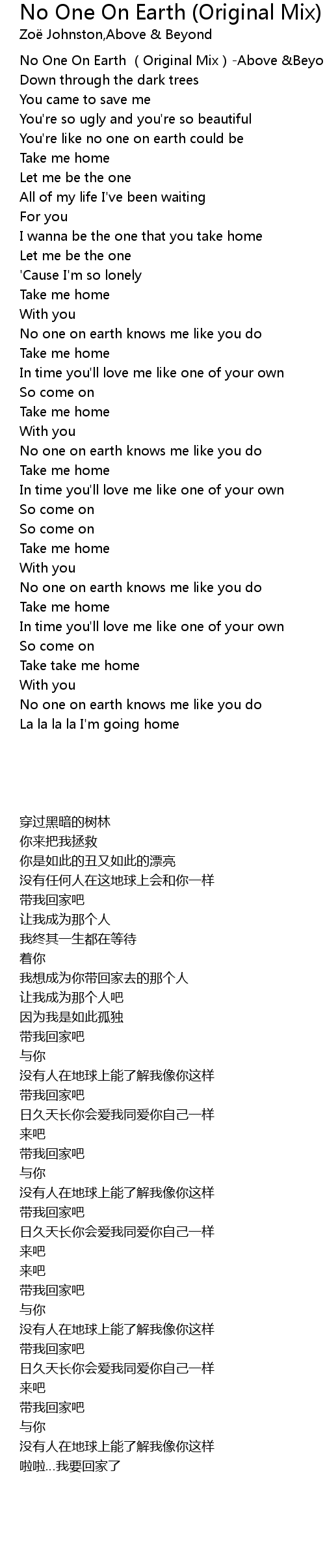 | [00:00.127] | No One On Earth (Original Mix)-Above &Beyond/ZoëJohnston |