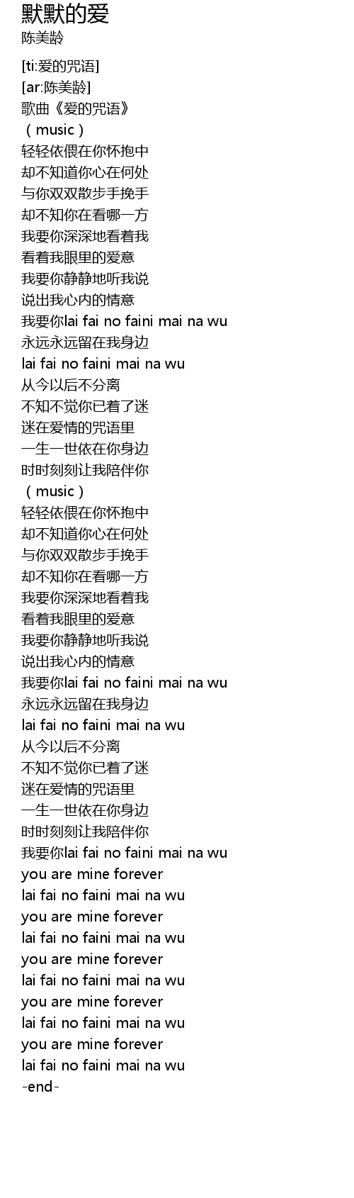 | [02:31.56] | wǒ yào nǐ lai fai no faini mai na wu |