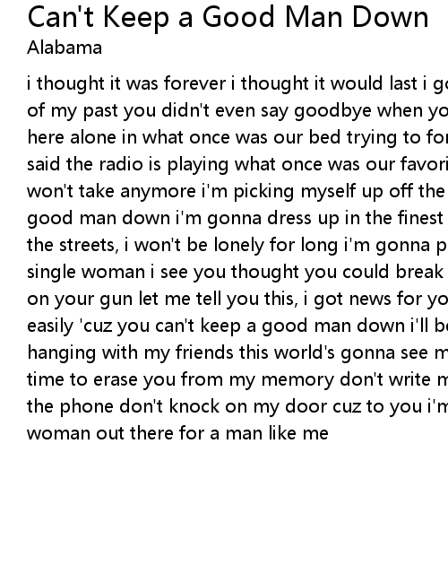 | i thought it was forever i thought it would last i gotta try to make it a page of my past you didn't even say goodbye when you slammed that door now i'm lying here alone in what once was our bed trying to forget all the cruel words you said the radio is playing what once was our favorite song enough is enough i won't take anymore i'm picking myself up off the floor 'cuz you can't keep a good man down i'm gonna dress up in the finest clothes that i own and take it to the streets, i won't be lonely for long i'm gonna put on my best moves on every single woman i see you thought you could break me add me to your list, notch me on your gun let me tell you this, i got news for you baby i don't break that easily 'cuz you can't keep a good man down i'll be out there on the scene hanging with my friends this world's gonna see me smiling again i'm taking some time to erase you from my memory don't write me any letters, don't call me on the phone don't knock on my door cuz to you i'm not at home i know there's a woman out there for a man like me |