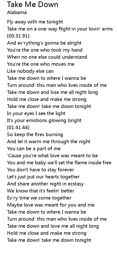 | [01:17.43] | Take me down' take me down tonight |