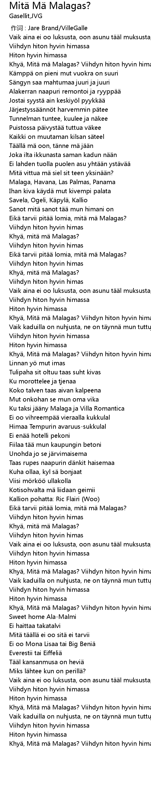 | [02:40.87] | Khyä, Mitä mä Malagas? Viihdyn hiton hyvin himas |