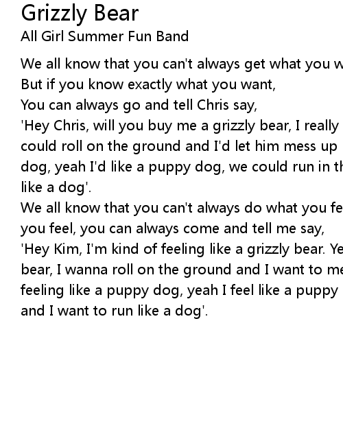 'Hey Kim, I'm kind of feeling like a grizzly bear. Yeah, I feel like a grizzly bear, I wanna roll on the ground and I want to mess up your hair. Cause I'm feeling like a puppy dog, yeah I feel like a puppy dog, I wanna run in the yard and I want to run like a dog'. |
