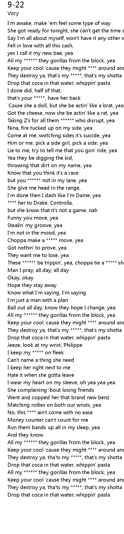 | [00:23.47] | All my ****** they gorillas from the block, yea |