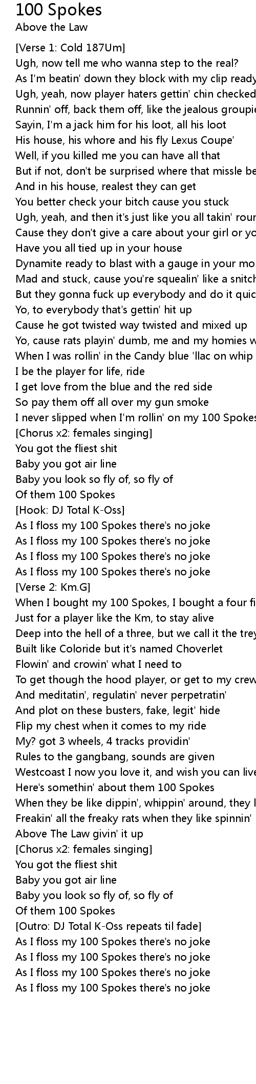 As I floss my 100 Spokes there's no joke |