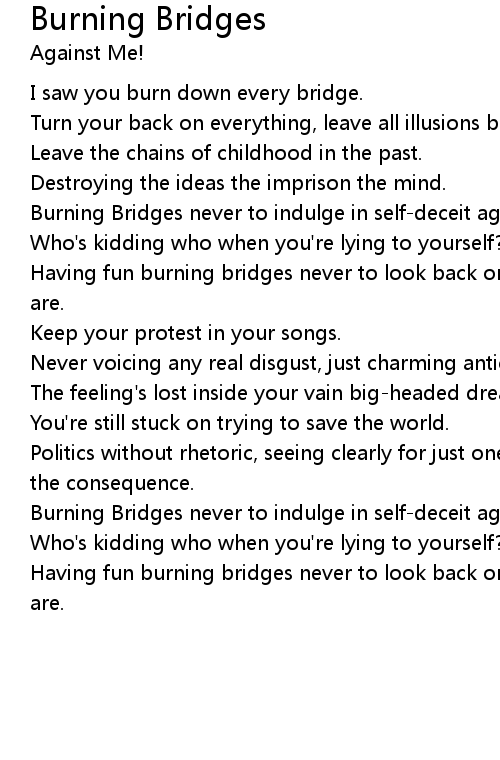 Having fun burning bridges never to look back on the past that made you what you are. |