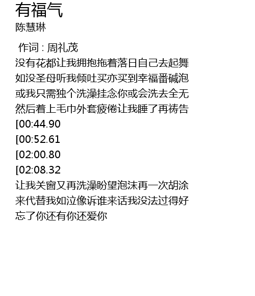 | [02:31.49][02:00.80][01:00.24] | 不要去羡慕不要去妒忌真的不想得到这福气 |