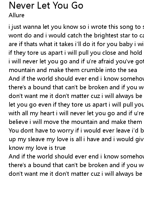 i just wanna let you know so i wrote this song to show you there is nothing i wont do and i would catch the brightest star to cary me straight to where you are if thats what it takes i'll do it for you baby i will never let you go even if they tore us apart i will pull you close and hold on to you with all my heart i will never let you go and if u're afraid you've gotta believe i will move the mountain and make them crumble into the sea |