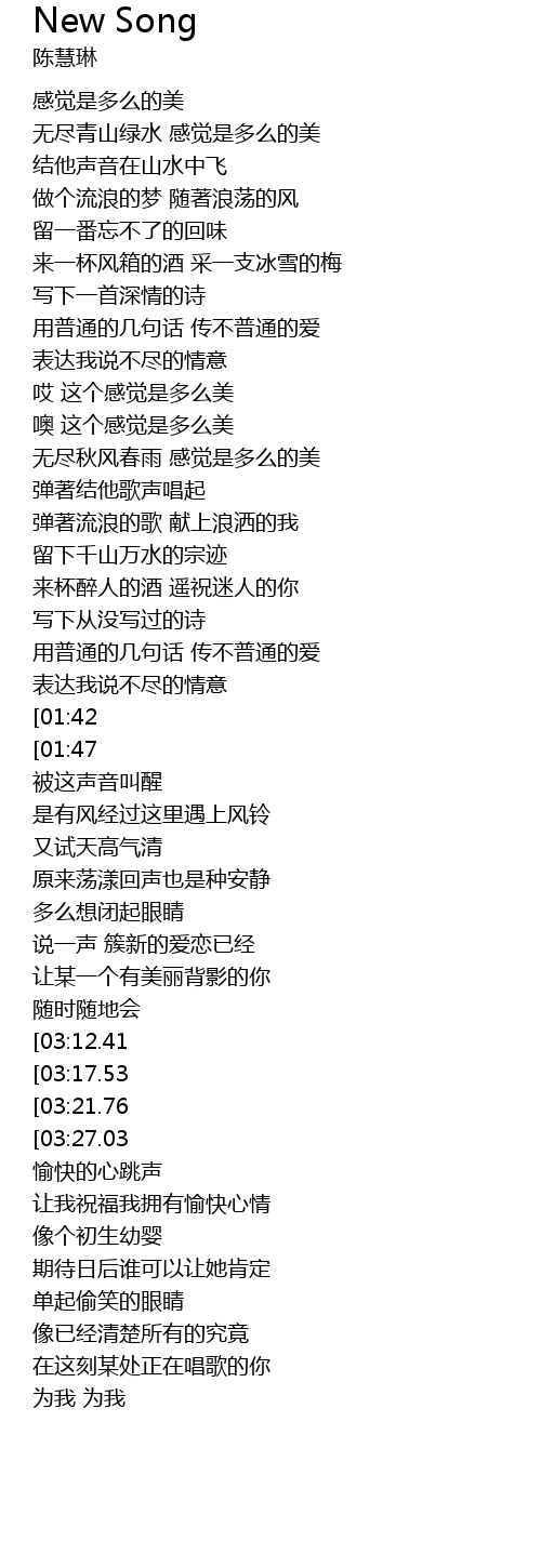 | [03:41.79][03:21.76][02:41.31][01:21.15] | 我就这样用新的愿望作歌 |