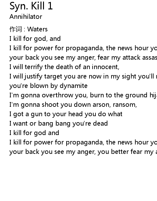| I kill for power for propaganda, the news hour you know my cause so don't turn your back you see my anger, fear my attack assassinate kidnap and murder, | |