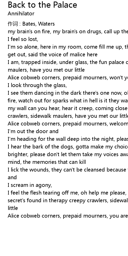 | Alice cobweb corners, prepaid mourners, you are now back in the palace |