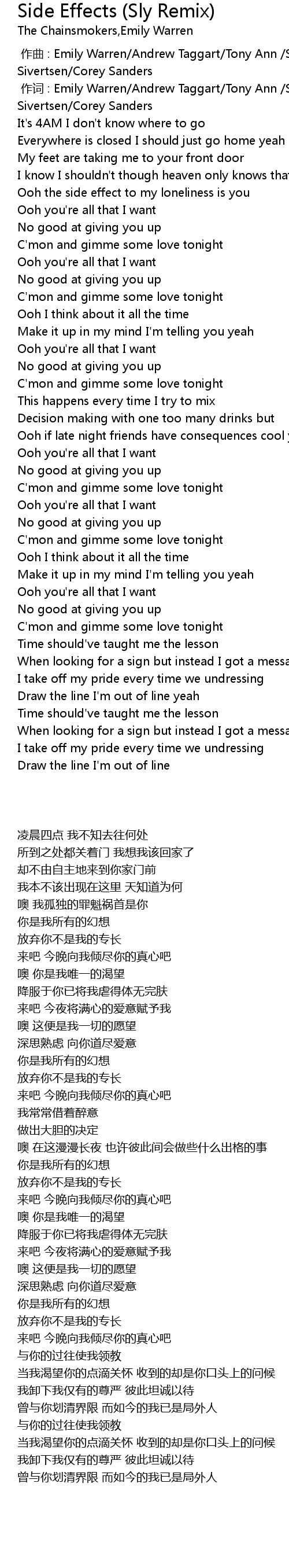 | [00:00.692] | 作词 : Emily Warren/Andrew Taggart/Tony Ann /Sylvester Willy Sivertsen/Corey Sanders |