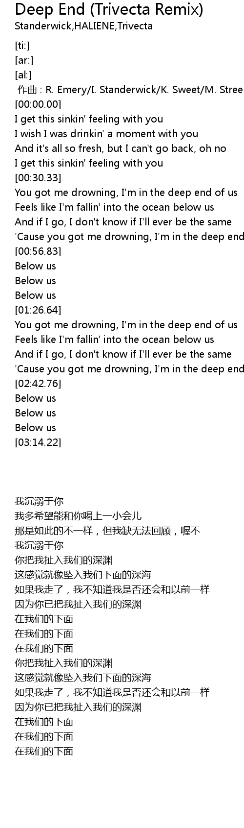 | [00:30.90] | You got me drowning, I' m in the deep end of us |