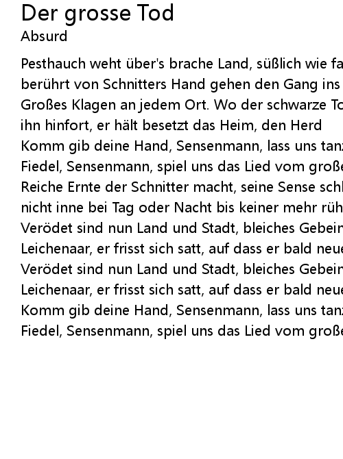 | Komm gib deine Hand, Sensenmann, lass uns tanzen den Totentanz. Komm spiel deine Fiedel, Sensenmann, spiel uns das Lied vom gro en Tod! |