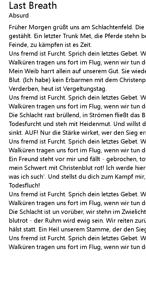 | Uns fremd ist Furcht. Sprich dein letztes Gebet. Walvater uns zur Seite steht. Walkü ren tragen uns fort im Flug, wenn wir tun den letzten Atemzug |