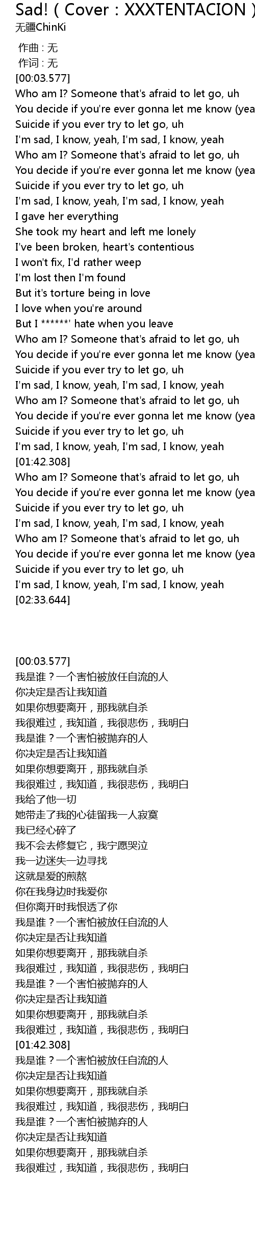 | [00:47.933] | I'm sad, I know, yeah, I'm sad, I know, yeah |