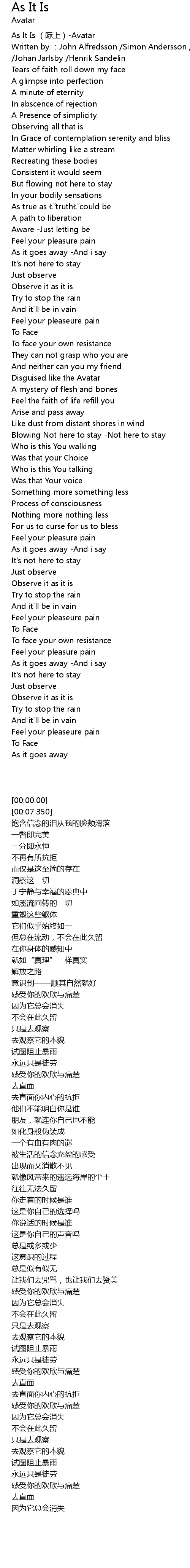 | [00:00.00] | As It Is jì shàng Avatar |