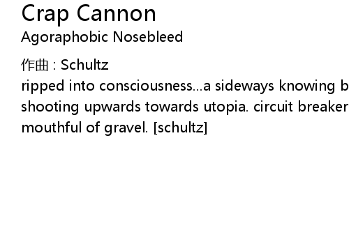 | ripped into consciousness...a sideways knowing banter. administer the forecast. shooting upwards towards utopia. circuit breaker flipped, canceling the ride. mouthful of gravel. [schultz] |