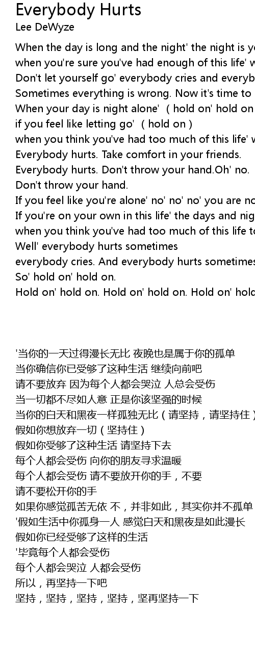 | [02:03.92] | Everybody hurts. Don' t throw your hand. Oh' no. |