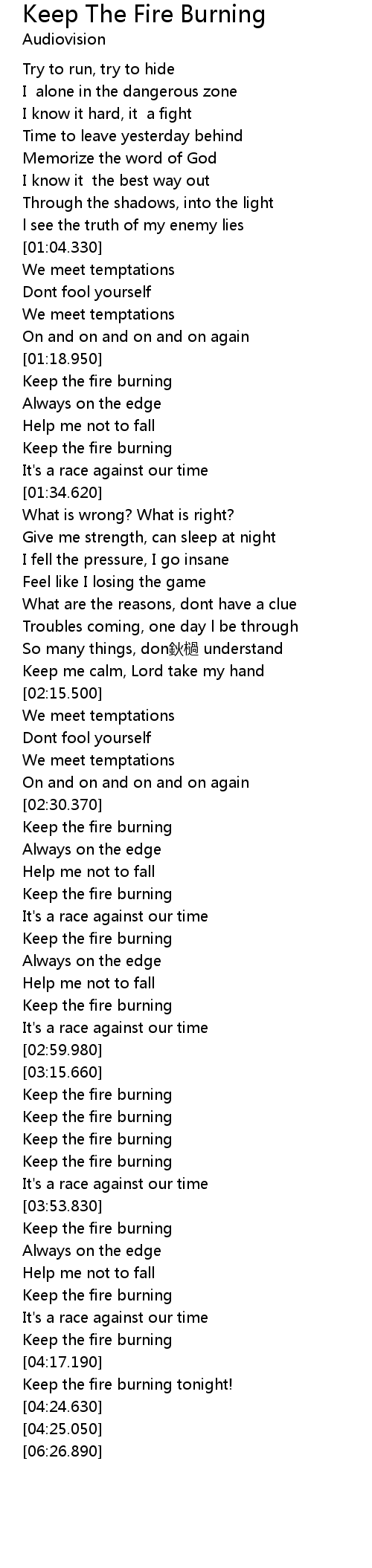 | [04:13.900] | Keep the fire burning |
