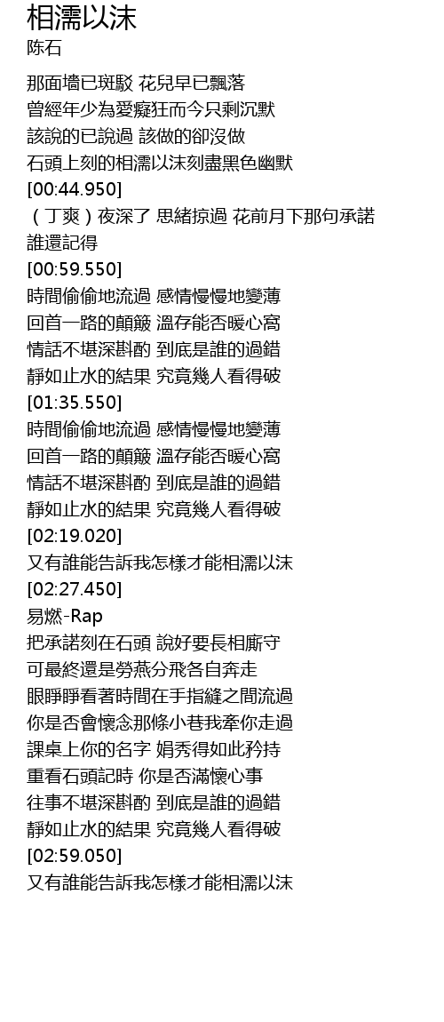 | [03:02.250] | 又有誰能告訴我怎樣才能相濡以沫 |
