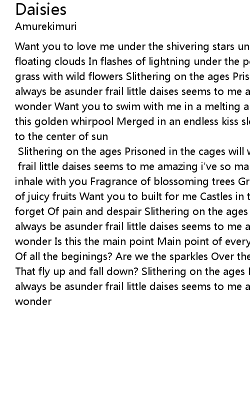 frail little daises seems to me amazing i've so many things to wonder Want to inhale with you Fragrance of blossoming trees Greedily penetrate Into the pulp of juicy fruits Want you to built for me Castles in the air Want you to make me forget Of pain and despair Slithering on the ages Prisoned in the cages will we always be asunder frail little daises seems to me amazing i've so many things to wonder Is this the main point Main point of everything Is this flame a begining Of all the beginings? Are we the sparkles Over the bonfire Are we the moments That fly up and fall down? Slithering on the ages Prisoned in the cages will we always be asunder frail little daises seems to me amazing i've so many things to wonder |